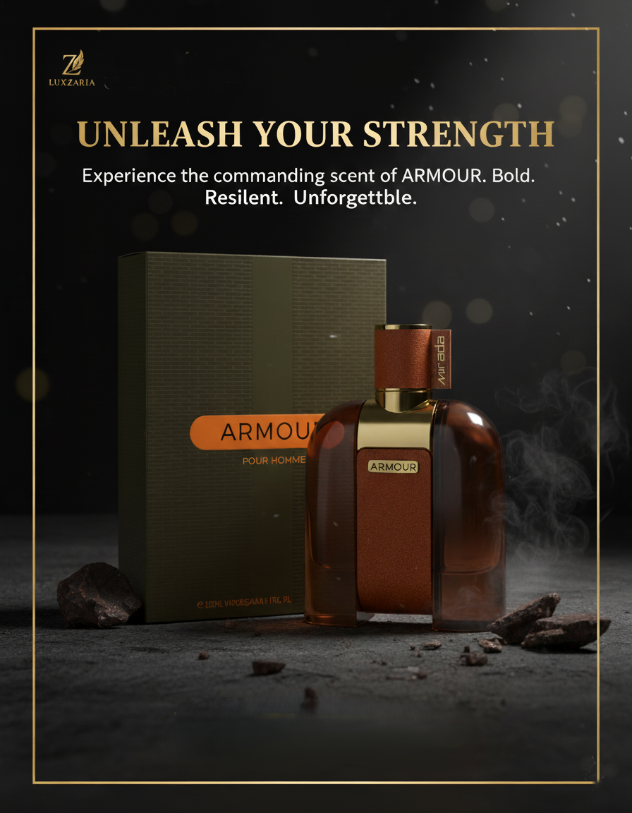 Opening with a burst of fresh citrus and marine notes, Armour instantly awakens your senses and sets a dynamic tone. As the fragrance evolves, a spicy heart of geranium, muguet, cardamom, and pepper emerges — symbolizing strength and energy. The base settles into amber, musk, cedarwood, and patchouli, creating a deep, masculine warmth that lingers with sophistication.